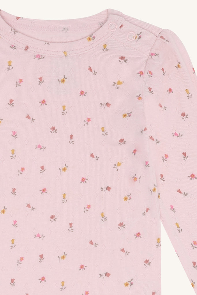 Dieser schöne Einteiler ist zart rosa und hat ein niedliches Blümchenmuster in pudrigen Tönen. Sehr süß ist ein ganz fein eingestricktes Rautenmuster (ganz feines Lochmuster). Wir lieben den Retrostil dieses Bodys sehr.
