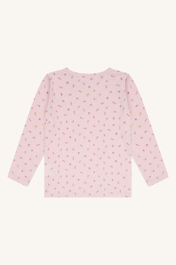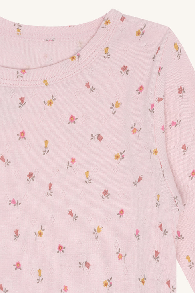 Das Shirt ist langärmlig und hat ein schönes Puderrosa (Chalk Pink). Sehr hübsch ist das zarte Blütenmuster in Kombination mit einem hauchzarten kleinen Lochmuster.
