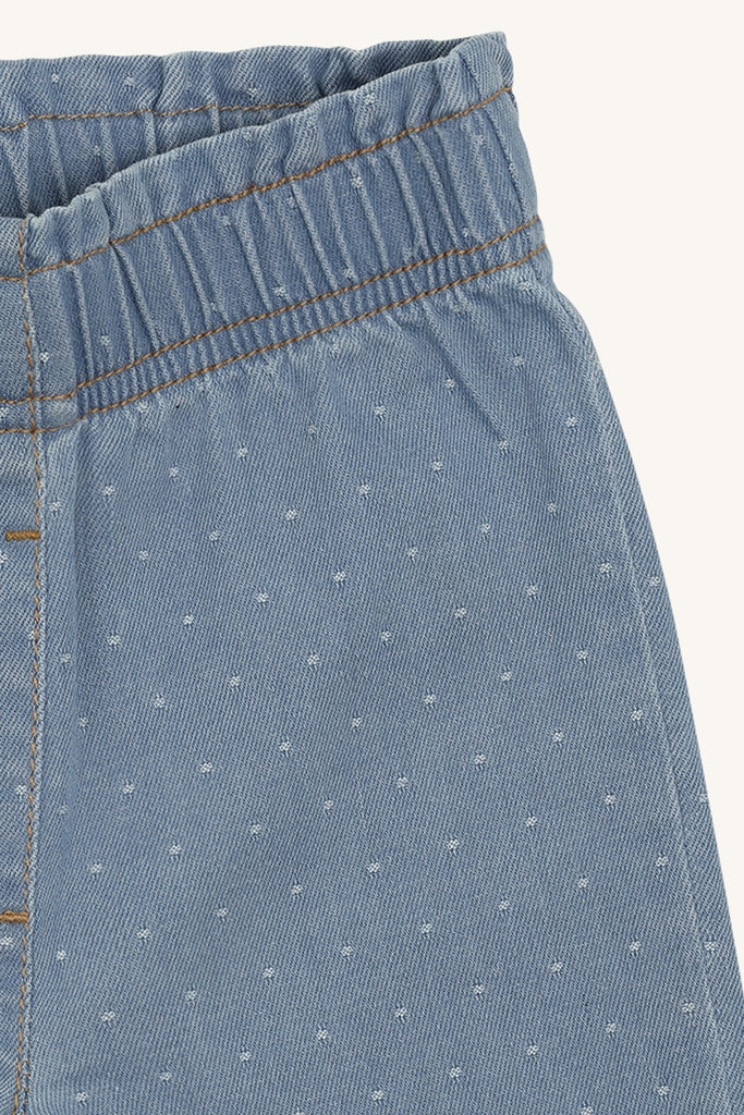 Sie hat den Farbton "Blue Denim", ein schönes Hellblau. Ein zusätzlicher Hingucker sind die kleinen zartblauen Pünktchen auf der Hose und natürlich auch die süßen Rüschen an den Beinen unten.