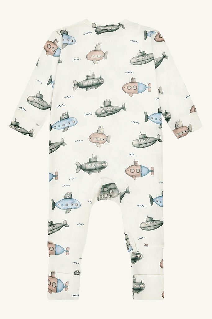 Dieser tolle Einteiler ist elfenbeinweiß und hat einen wunderschön gezeichneten Print mit U-Booten.